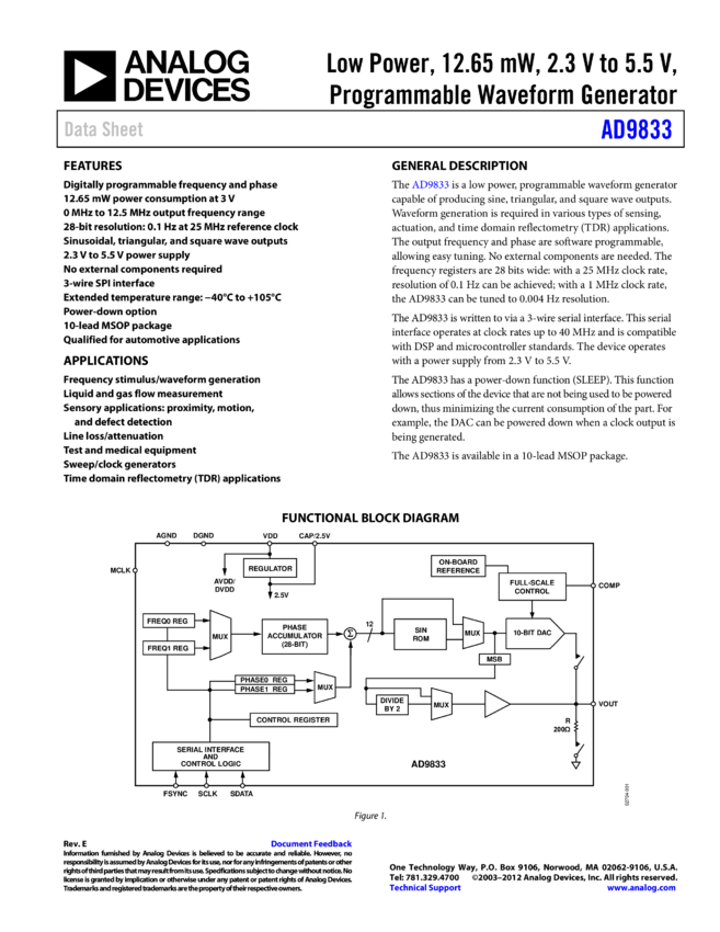 AD9833: Low Power, 12.65 W, 2.3 V to +5.5 V, Programmable Waveform Generator