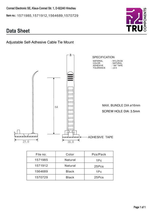 Podstawa montażowa TRU COMPONENTS WCT-64 1206769, 16 mm (max), 1 szt.
