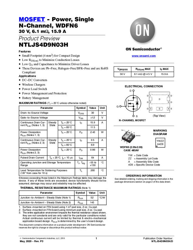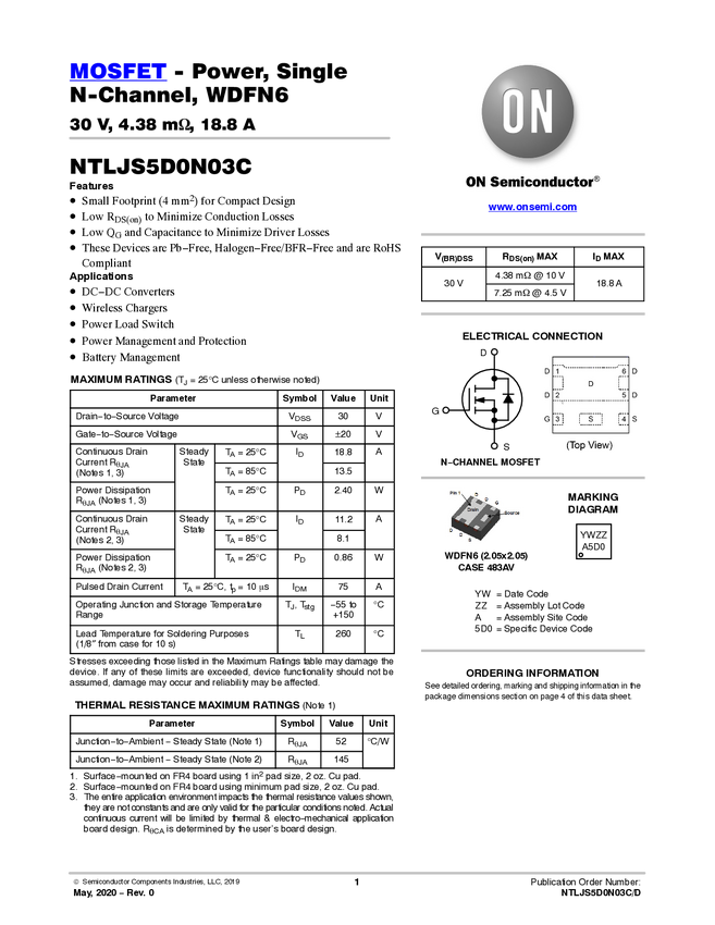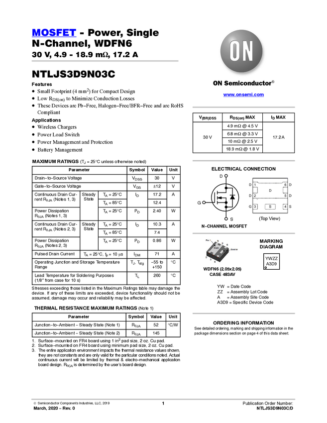 MOSFET, Power, 30V, N-Channel, WDFN6