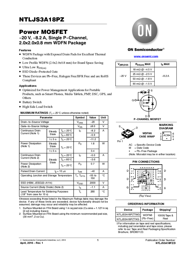 Power MOSFET -20V -8.2A 18 mOhm Single P-Channel WDFN6 with ESD Protection