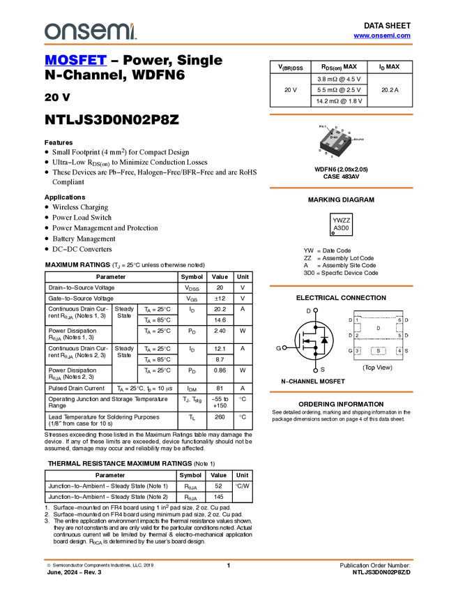 MOSFET, Power, 20V, N-Channel, WDFN6