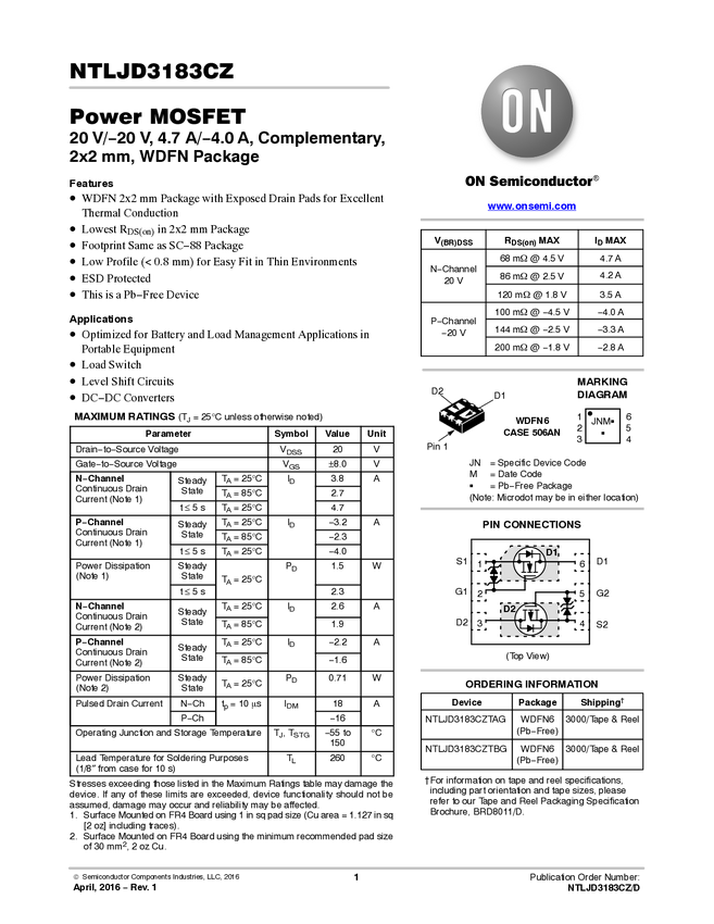 Power MOSFET 20V 4.6A 65 mOhm Complementary WDFN6
