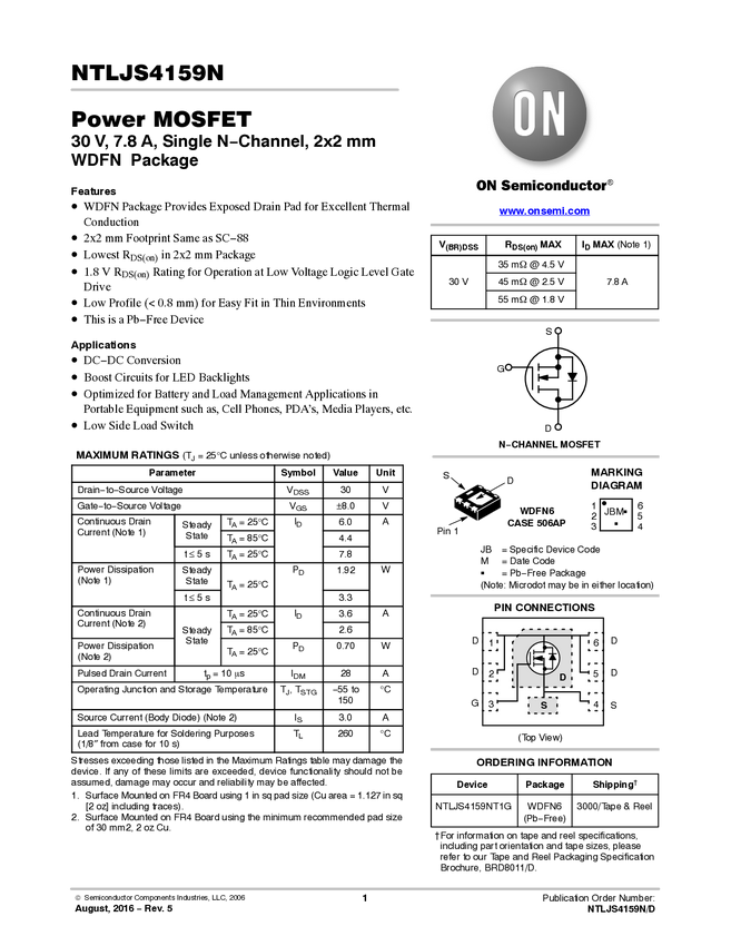 Power MOSFET 30V 7.8 A 35 mOhm Single N-Channel WDFN6