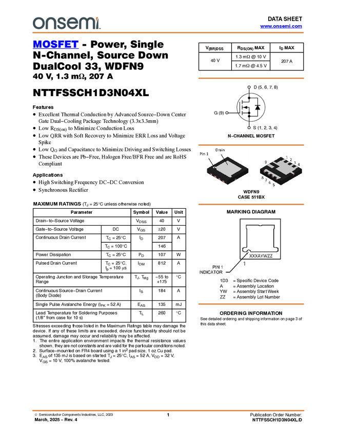 MOSFET - Power, Single, N-Channel, Source Down Dual Cool 33, WDFN9, 40V, 1.3mΩ, 207A