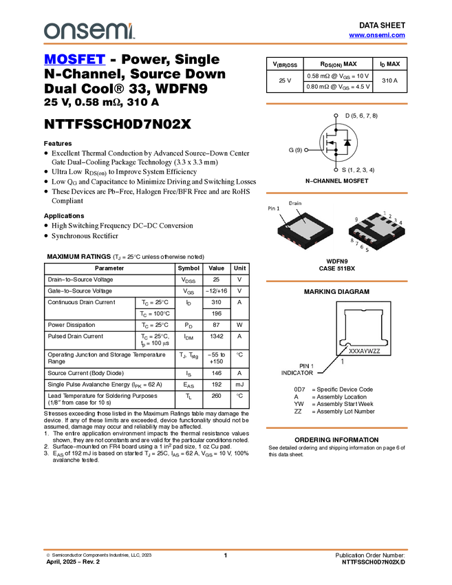 Power MOSFET, Single, N-Channel, 25V/0.85mΩ, WDFN9 3x3, Source Down