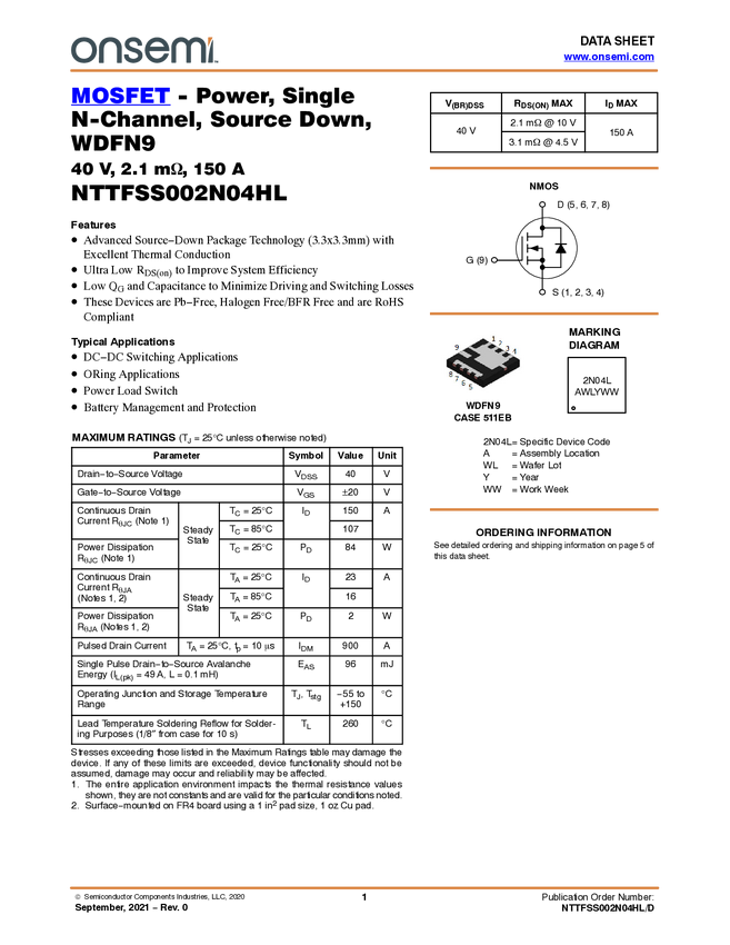 Power MOSFET, Single, N-Channel, 40V/2.1mΩ, WDFN9 3x3, Source Down