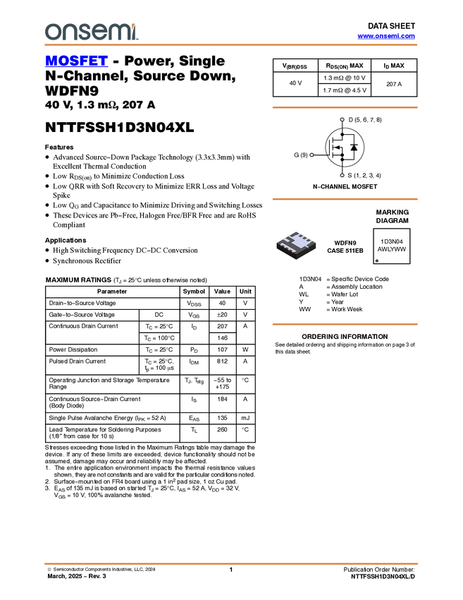 MOSFET - Power, Single, N-Channel, Source Down 33, WDFN9, 40V, 1.3mΩ, 207A