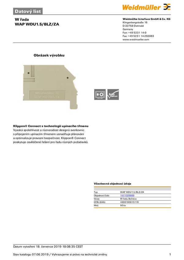 Płyta zamykająca Weidmüller WAP WDU1.5/BLZ/ZA 1577320000, 50 szt.