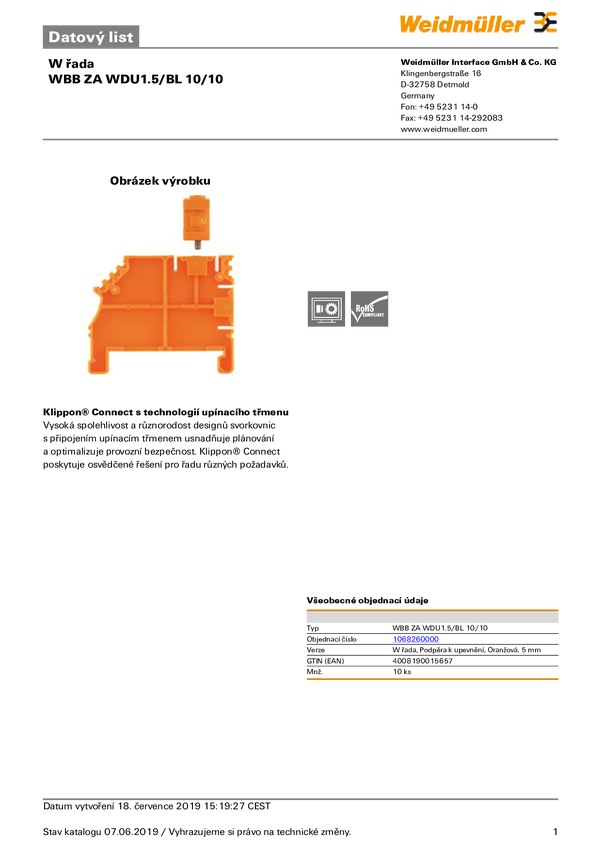 Element mocujący Weidmüller WBB ZA WDU1.5/BL 10/10 1068260000, 10 szt.