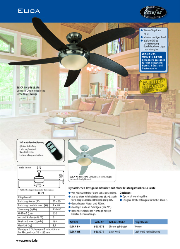 CasaFan Elica WE Wentylator sufitowy 65 W (Ø x W) 132 cm x 340 mm biały tryb zimowy, pilot zdalnego sterowania, podświet