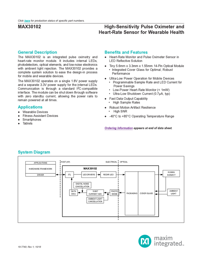 MAX30100 Pulse Oximeter and Heart-Rate Sensor IC for Wearable Health