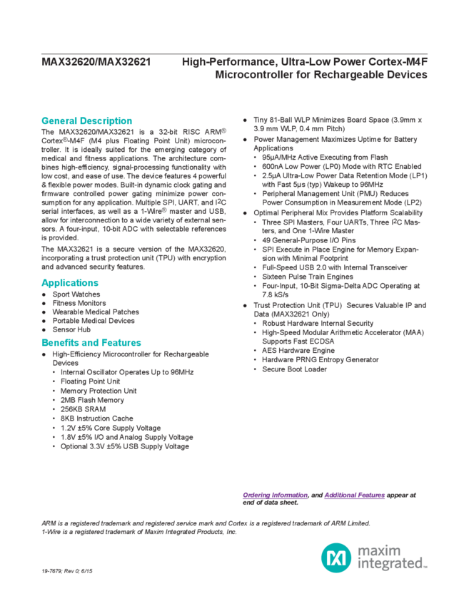 MAX32621 Ultra-low power Cortex-M4F ideally suited for emerging wearable medical and fitness applications.
