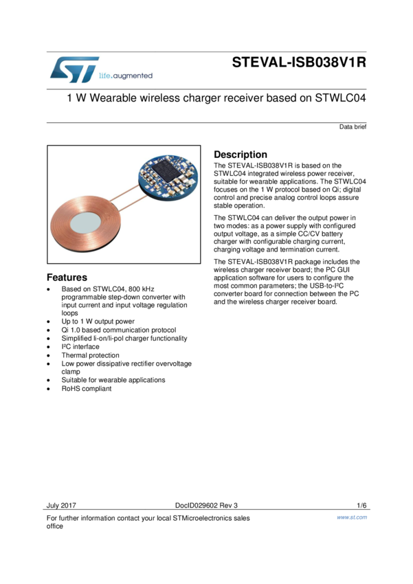 1 W Wearable wireless charger receiver based on STWLC04