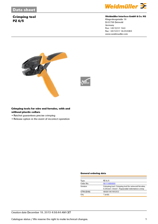 Crimping Tool For MTR 110 Cable Lugs, Connectors and Wire-End Ferrules