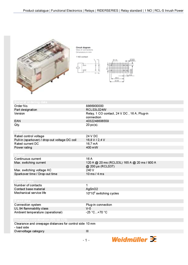 Electromechanical Relay SPST-NO 16A 24VDC 1.44KOhm Plug-In