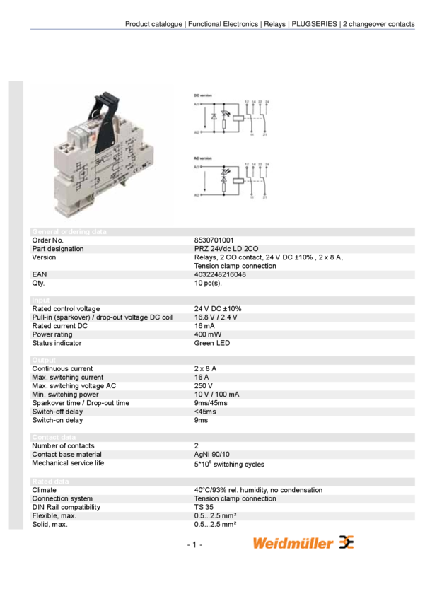 Electromechanical Relay DPDT 16A 24VDC 1.14KOhm DIN Rail
