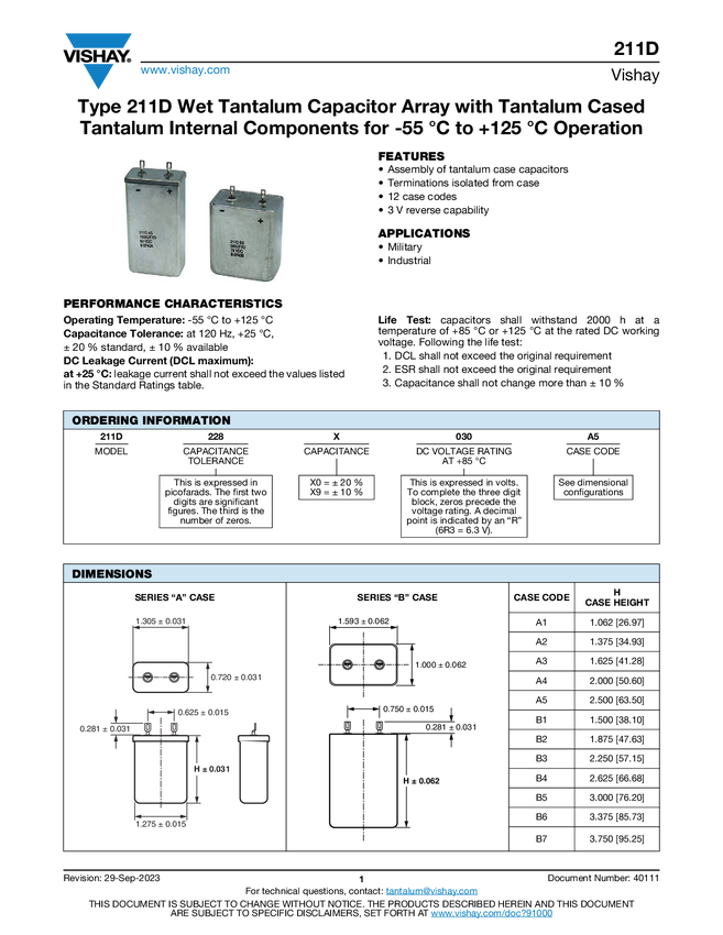 Wet Tantalum Capacitors Tantalum-Case With Glass-to-Tantalum Hermetic Seal for -55 °C to +125 °C Operation