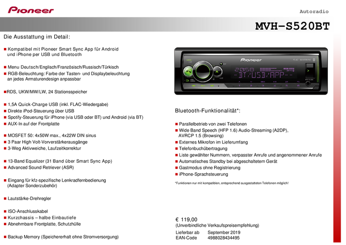 Pioneer MVH-S520BT Radio samochodowe Zestaw głośnomówiący Bluetooth® , Aplikacja Radiowa