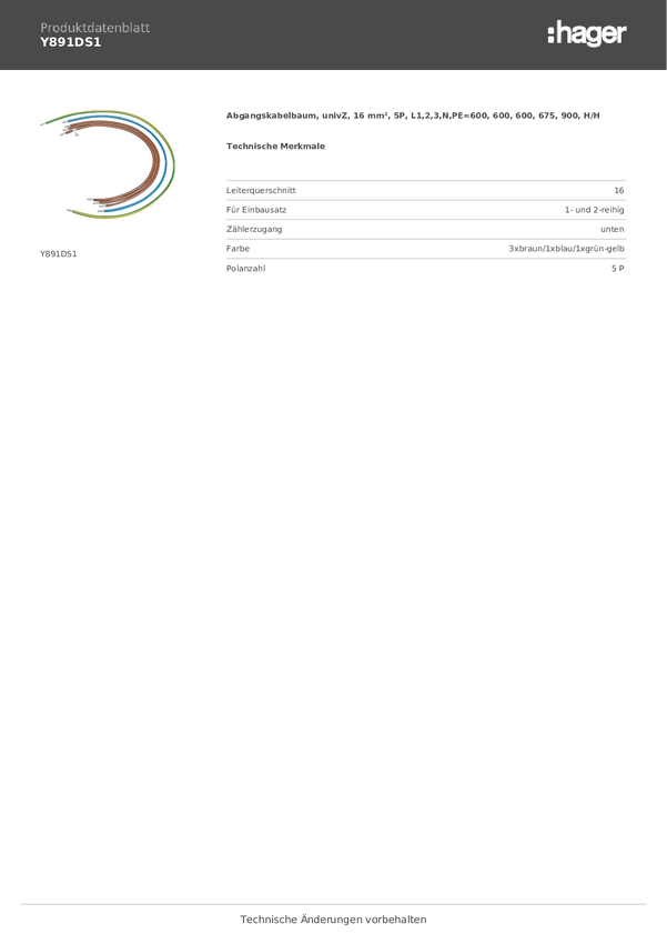Hager Y891DS1 Wychodząca wiązka przewodów brązowy, niebieski, zielono-żółty 5 styków 16 mm² 1 szt.