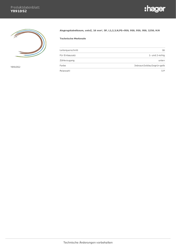 Hager Y891DS2 Wychodząca wiązka przewodów brązowy, niebieski, zielono-żółty 5 styków 16 mm² 1 szt.
