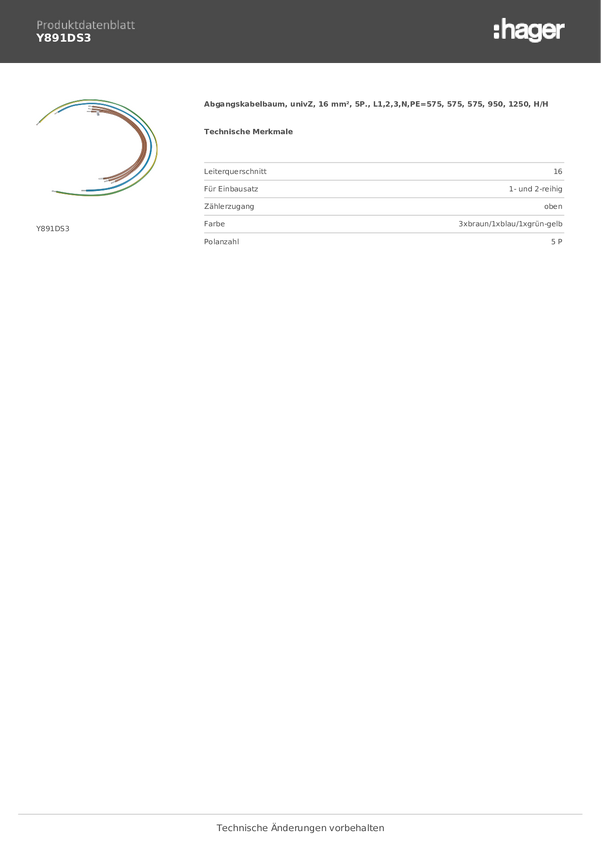 Hager Y891DS3 Wychodząca wiązka przewodów brązowy, niebieski, zielono-żółty 5 styków 16 mm² 1 szt.
