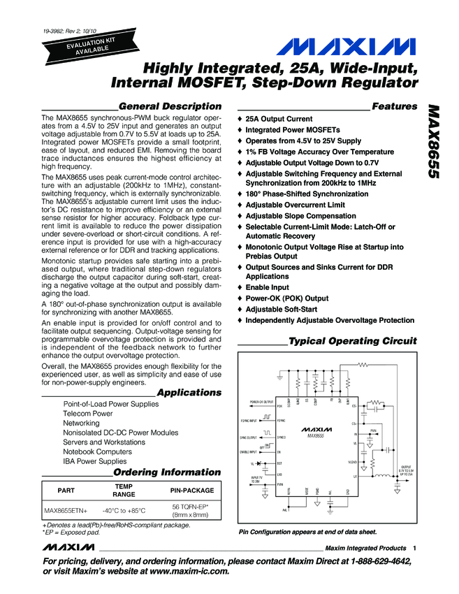 MAX8655 Highly Integrated, 25A, Wide-Input, Internal MOSFET, Step-Down Regulator