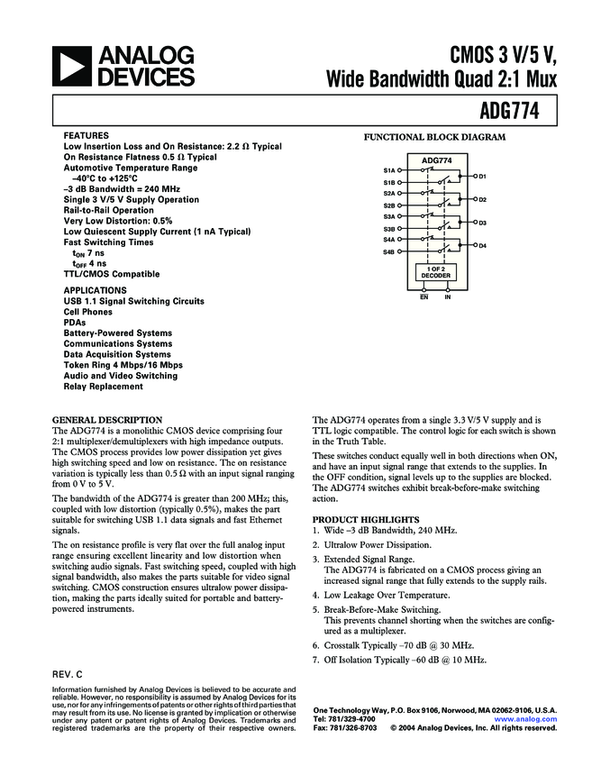 ADG774: 2.2 Ω, Wide Bandwidth, Low Voltage Quad SPDT Switch