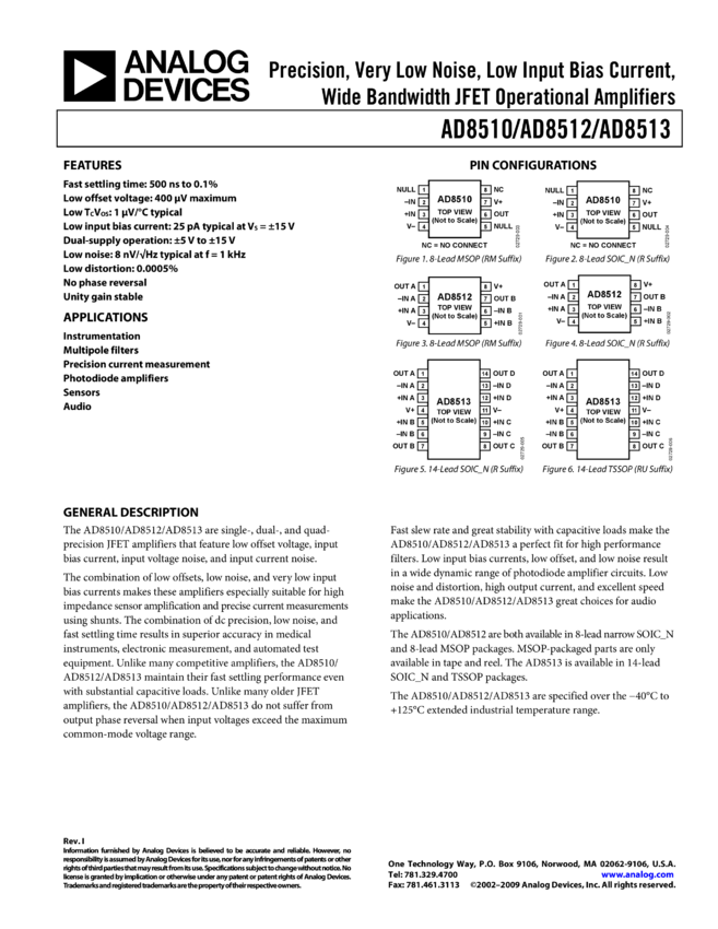 AD8512: Low Noise, Low Input Bias Current, Wide Bandwidth Precision JFET Dual Op Amp