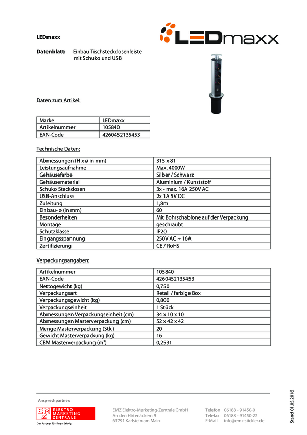 Wieża z gniazdami zasilania LEDmaxx TSD001 3 x Ilość gniazdek: 3