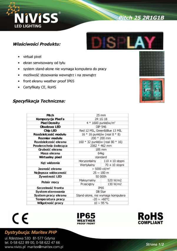 Ekran LED: JZDS25O-2R1G1B-B3C601, raster=25mm, 2R1G1B, wirtualny pixel, serwisowany od tyłu, powierzchnia świecenia: 1600 x 400mm