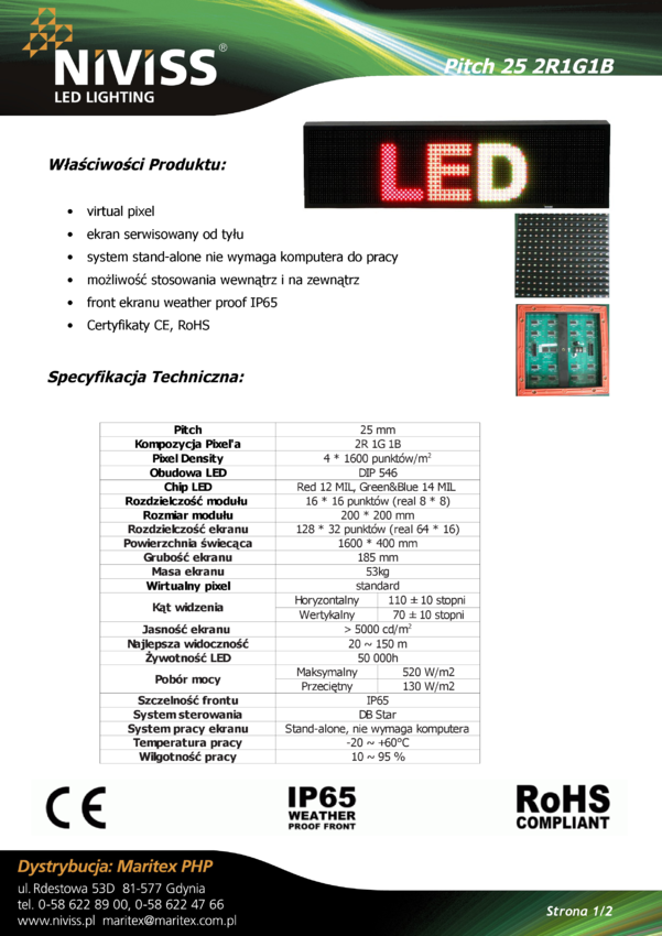Ekran LED: JZDS25O-2R1G1B-40X200, raster=25mm, 2R1G1B, wirtualny pixel, serwisowany od tyłu, powierzchnia świecenia: 2000 x 400mm