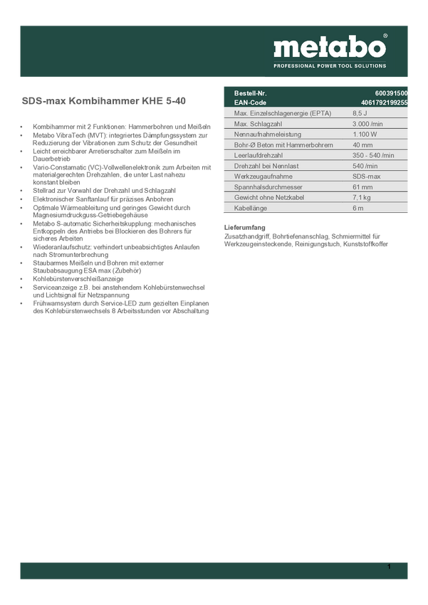 Młot wielofunkcyjny Metabo KHE 5-40 1100 W 600391500 1 szt.