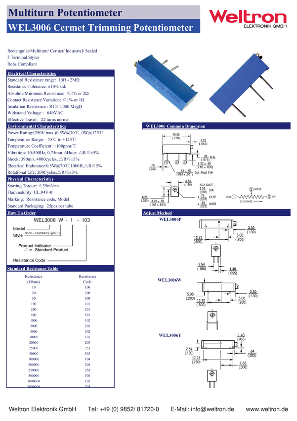 Potencjometr wieloobrotowy Weltron WEL3006-1-100-LF, 19mm 10R, 10% 0.5W 3006-1