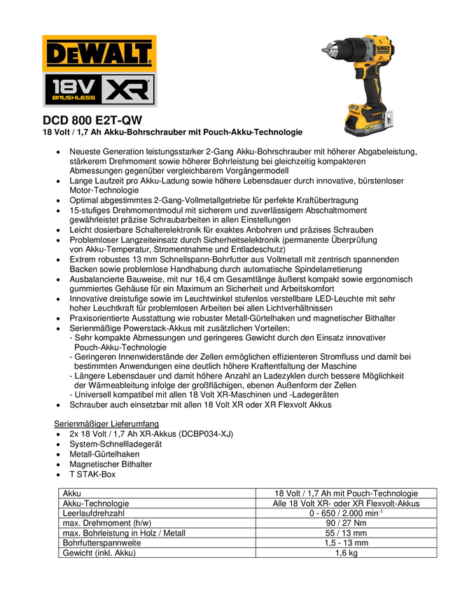 Wiertarko-wkrętarka akumulatorowa DEWALT DCD800E2T-QW