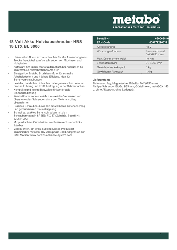 Wiertarko-wkrętarka akumulatorowa Metabo HBS 18 LTX BL 3000 620062840 18 V