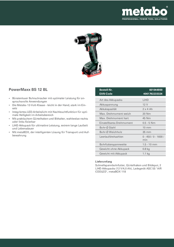 Wiertarko-wkrętarka akumulatorowa Metabo PowerMaxx BS 12 BL 601044800 12 V 4 Ah zaw. 2 akumulatory, zaw. ładowarkę, bezs