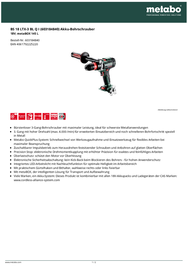 Wiertarko-wkrętarka akumulatorowa Metabo BS 18 L BL Q 613156840 18 V bezszczotkowy, zaw. walizkę, bez akumulatora, bez ł