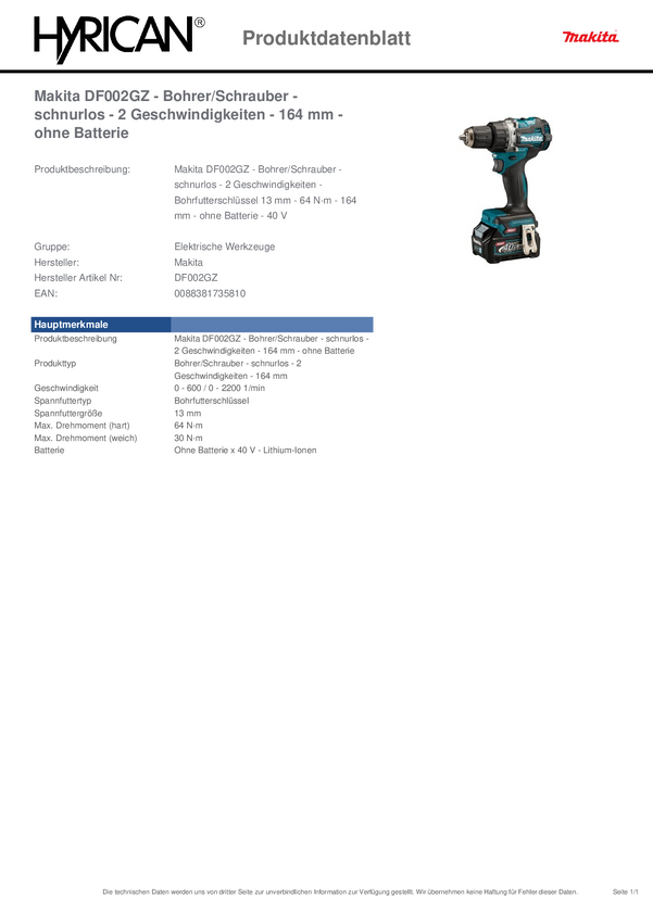 Wiertarko-wkrętarka akumulatorowa Makita S_0380_7114602 DF002GZ 40 V bez akumulatora