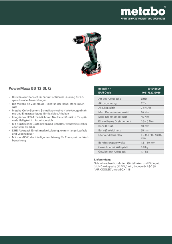 Wiertarko-wkrętarka akumulatorowa Metabo PowerMaxx BS 12 BL Q 601045800 12 V 4 Ah zaw. 2 akumulatory, zaw. ładowarkę, be