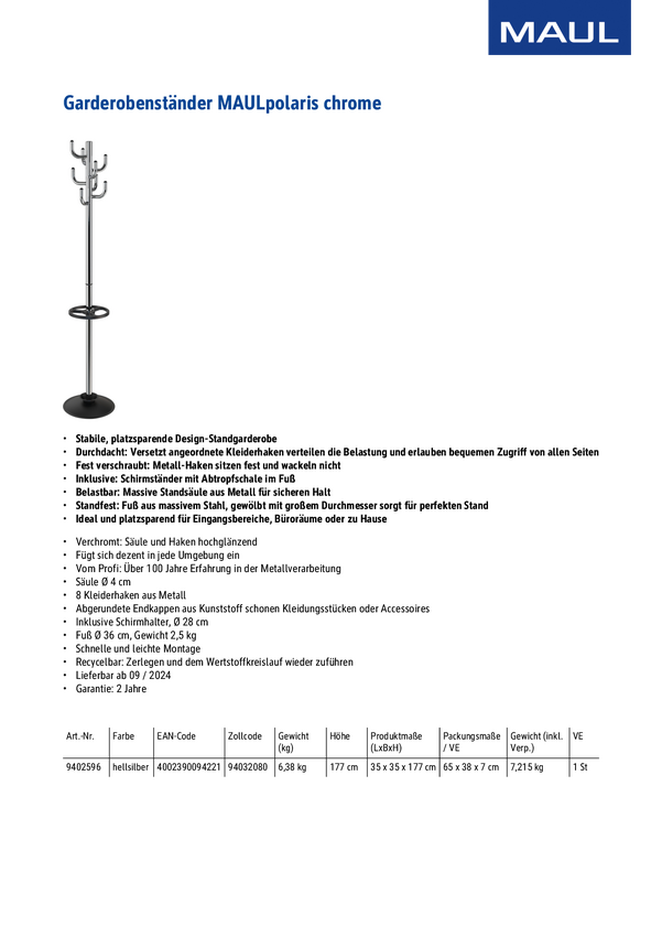 Wieszak do garderoby Maul MAULpolaris chrome 9402596 (S x W x G) 365 x 1770 x 365 mm chrom, jasnosrebrny