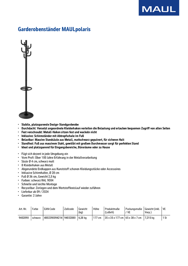 Wieszak do garderoby Maul MAULpolaris 9402090 (S x W x G) 365 x 1770 x 365 mm czarny (ral 9004, matowy)