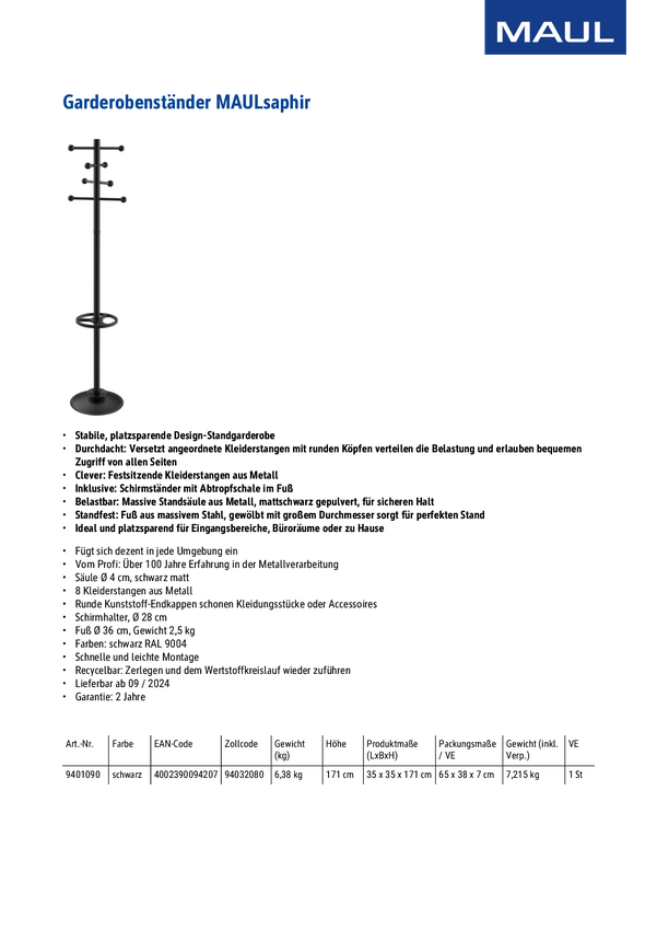 Wieszak do garderoby Maul MAULsaphir 9401090 (S x W x G) 380 x 1710 x 380 mm czarny (ral 9004, matowy)