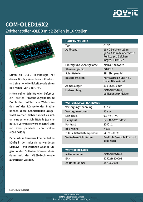 Moduł wyświetlacza Joy-it com-lcd 16x2 6.6 cm (2.6 cal) 16 x 4 Pixel Pasuje do: Arduino