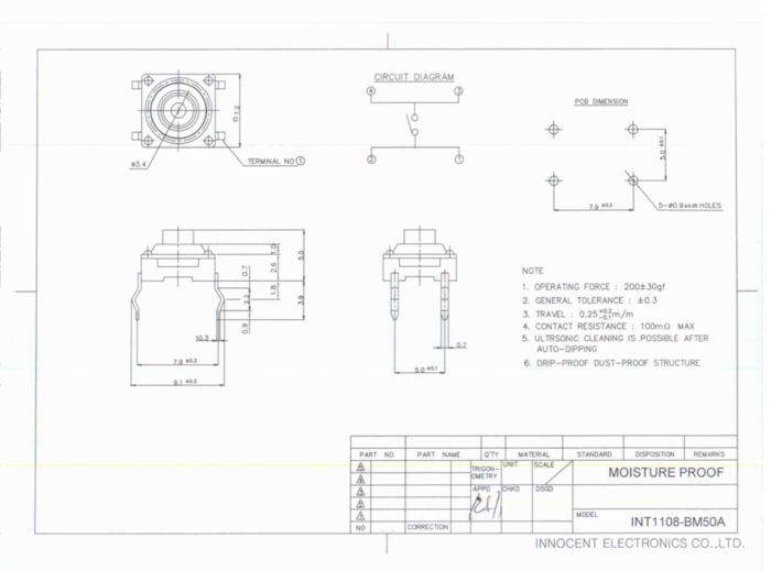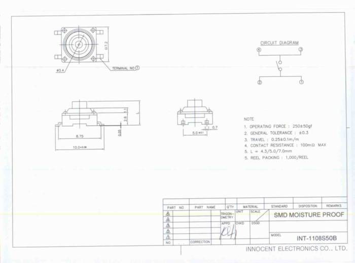 Odporny na wilgoć łącznik Tact Switch, , o sile nacisku 250gf, do montażu SMD,