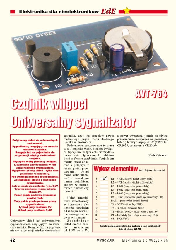 AVT764 Czujnik wilgoci, uniwersalny sygnalizator