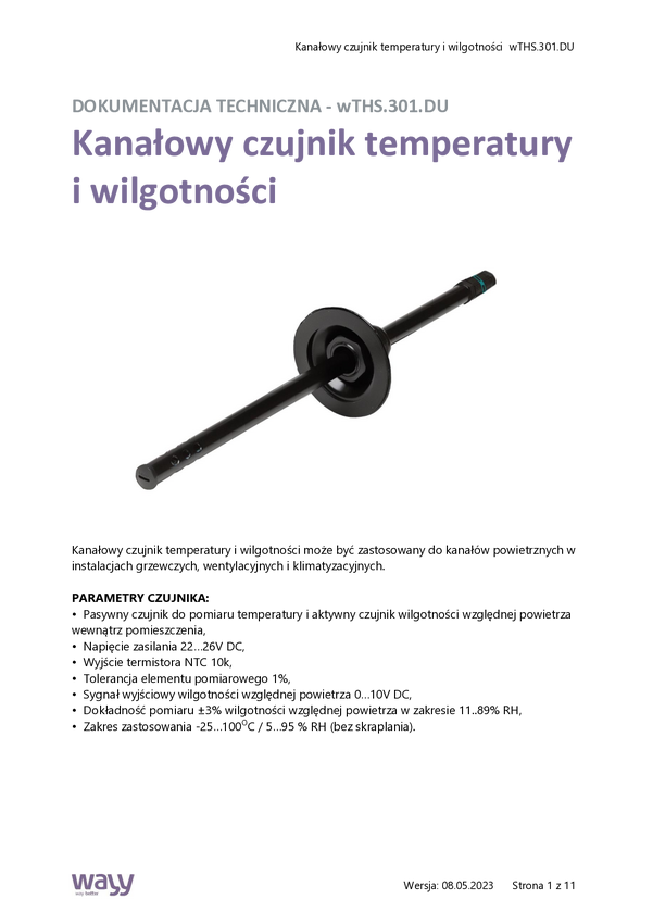 Kanałowy czujnik temperatury i wilgotności powietrza wTHS.301.DU