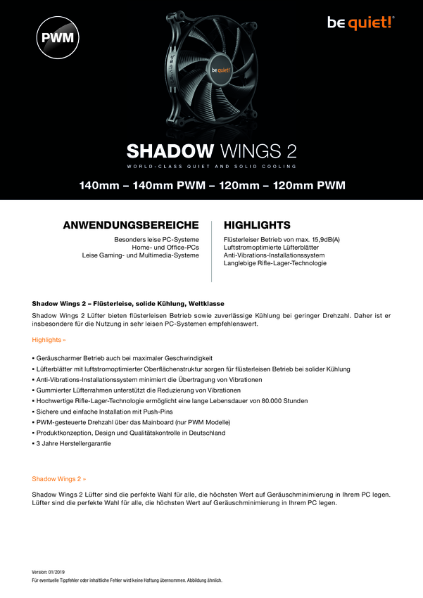 BeQuiet Shadow Wings 2 Wentylator do obudowy PC czarny (S x W x G) 140 x 140 x 25 mm