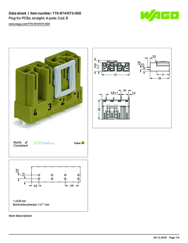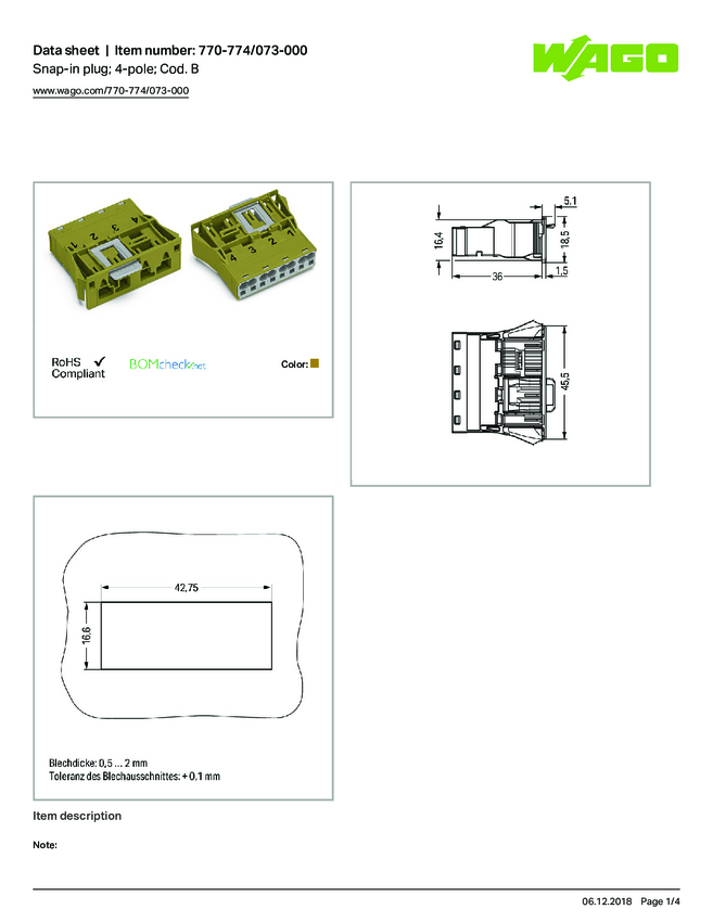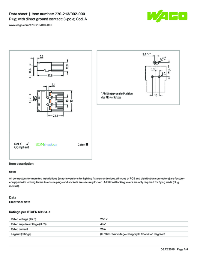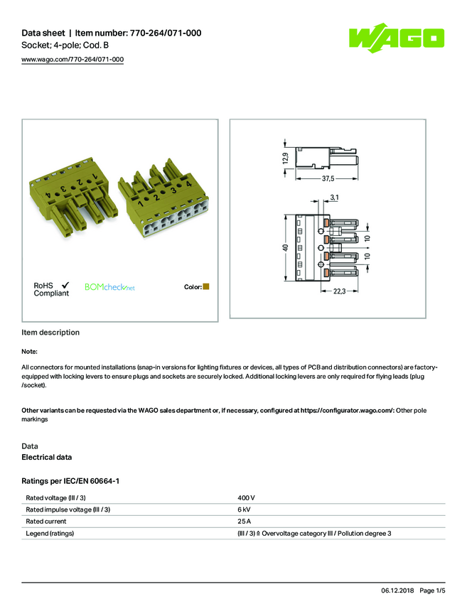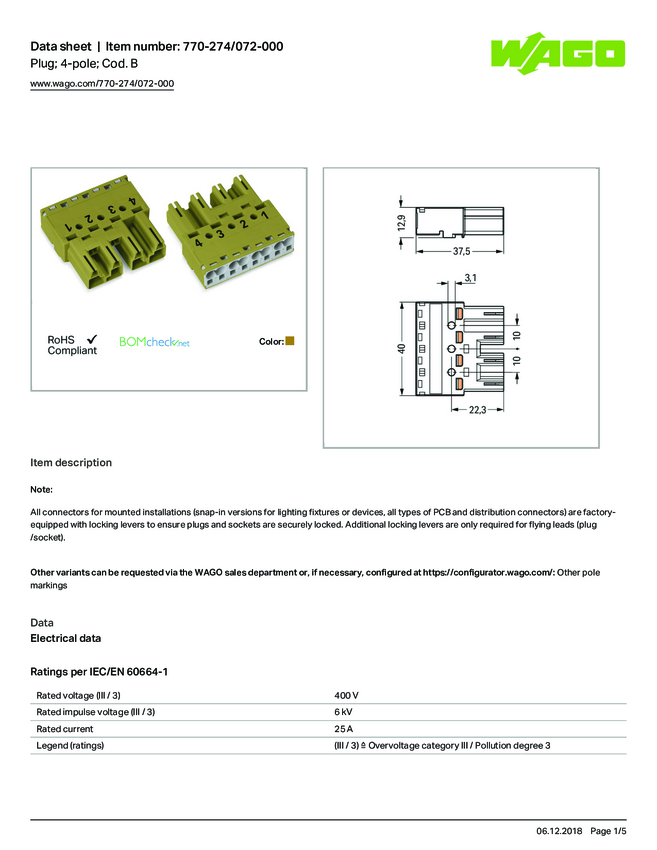 WAGO 770-874/071-000 Złącze męskie sieciowe WINSTA MIDI złącze męskie do wbudowania pionowego Łączna ilość styków: 4 25