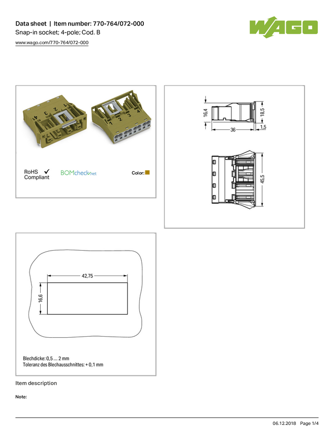 WAGO 770-764/072-000 Złącze męskie sieciowe WINSTA MIDI złącze żeńskie proste Łączna ilość styków: 4 25 A jasnozielony 1