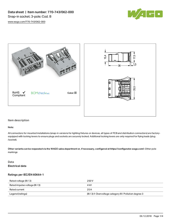 WAGO 770-743/062-000 Złącze męskie sieciowe WINSTA MIDI, styki: 3, 250 V, 25 A, 100 szt.